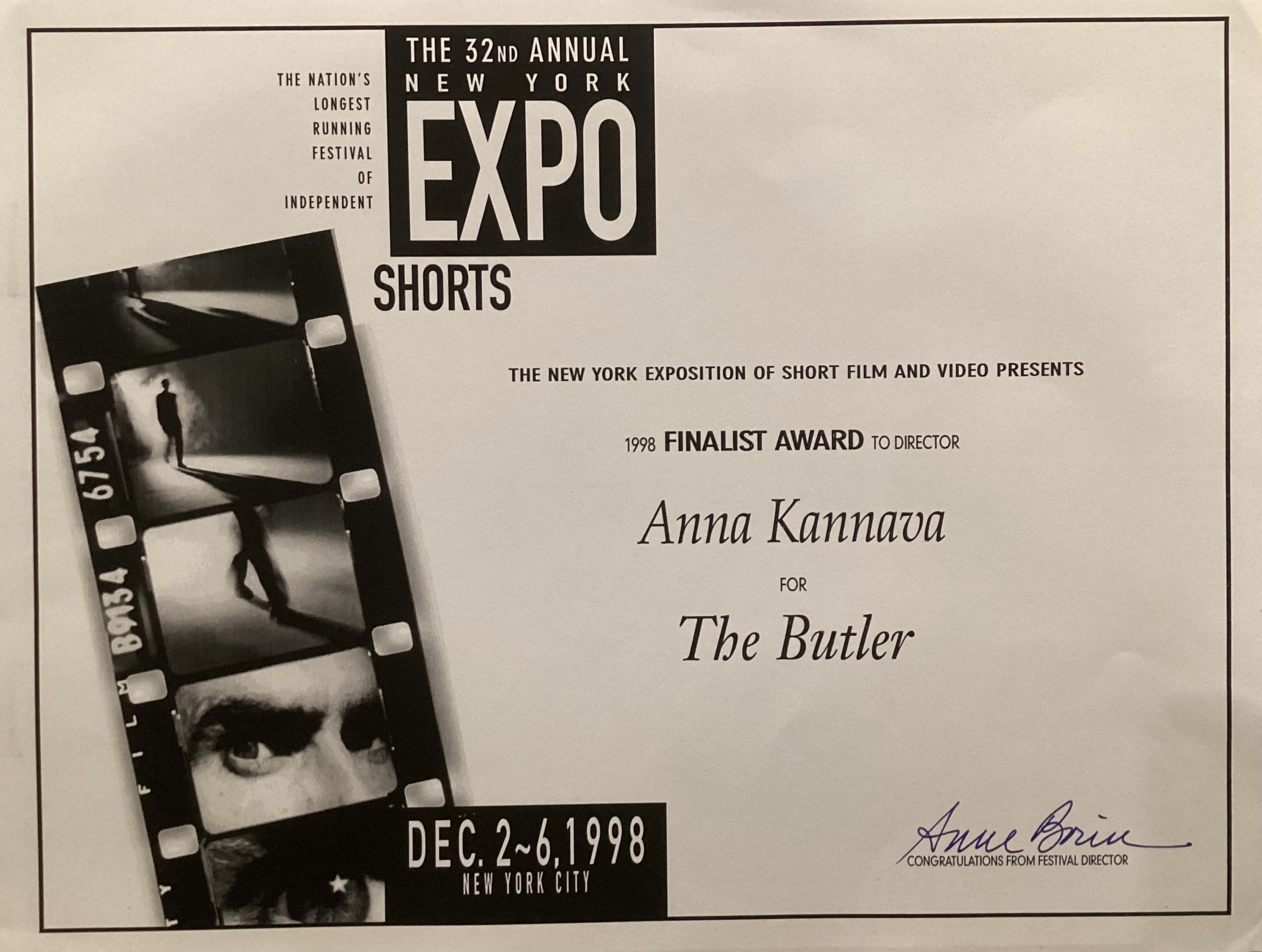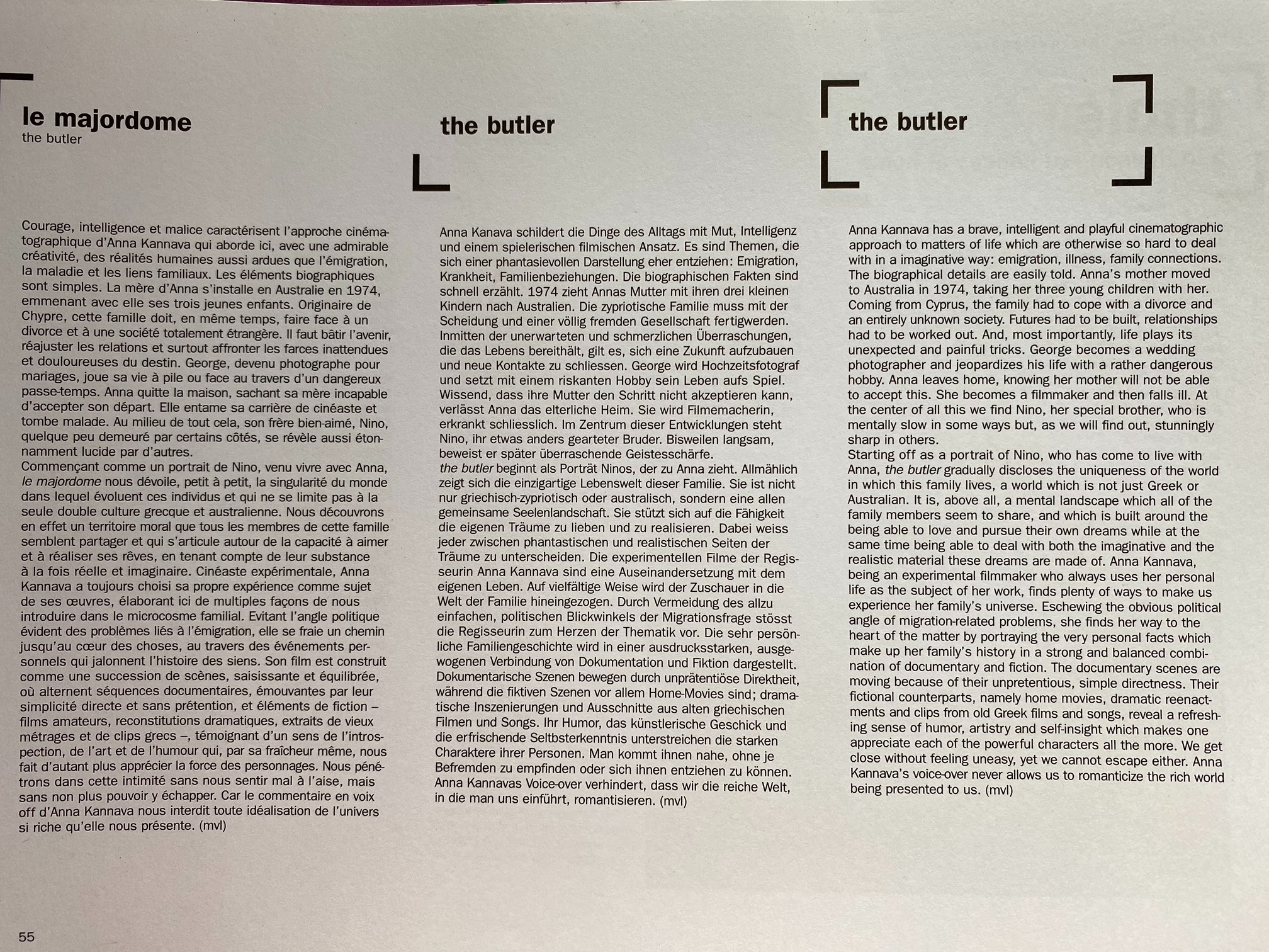 "Kannava's deftfly constructed, critically acclaimed The Butler (1996) characteristically features her narrating voice as it subtly works its way across an open-ended poetic, visual and aural iconography that speaks of the many behavioural cultural and historical intracacies of her life, especially in terms of Nino, 'the butler' of the film's title. This film is a vital essayistic document of her ambivalent, ironic and humorous exilic life between her past homeland, Cyprus, and her new host country, Australia. The frankness of her admission that she is suffering from the onset of the crippling disease scleroderma is a tragic undercurrent to an otherwise optimistic and lyrical take on her postcolonial life."